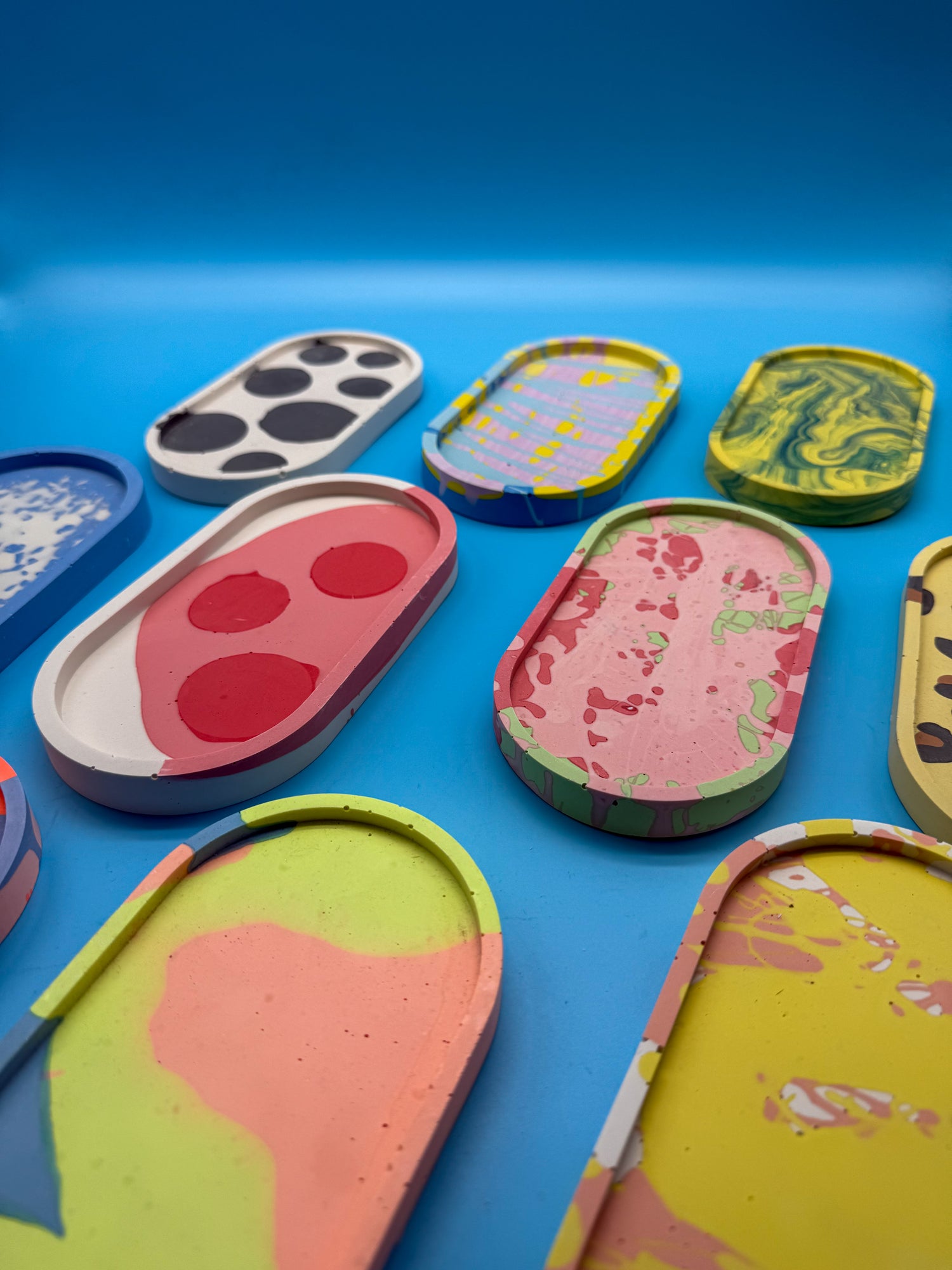 Entdeckt unsere exklusive Kollektion handgefertigter Ablagen aus hochwertigem Jesmonite in leuchtenden, knalligen Farben.